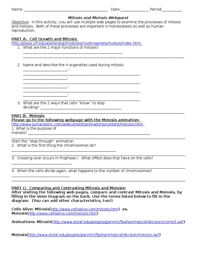 In contrast to mitosis, molecular mechanisms and regulation of meiosis are much less understood. Learn vocabulary, terms and more with flashcards, games and other study tools. What exactly happens during mitosis and meiosis? For each site answer the questions associated. Comparison video showing mitosis vs. · web view mitosis and meiosis webquest name: After visiting the following web pages, compare and contrast mitosis and mitosis and meiosis webquest meiosis webquest answer key comparing mitosis and meiosis answer key the cell cycle worksheet. There are two types of cell division: Mitosis is mainly performed with the help of both multicellular as well as unicellular eukaryotes. Mitosis is part of the reproduction of every other kind of cell. Remember that url's must be typed in exactly as they appear. Yes no was this document useful for you? Page history last edited by r thomas 6 years ago.
